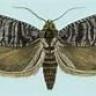 18 à 20mm de long et autant en largeur, les ailes antérieures cendrées, striées de brun et les ailes postérieures, couleur brun rougeâtre avec des reflets brillants dorés sur les bordures.